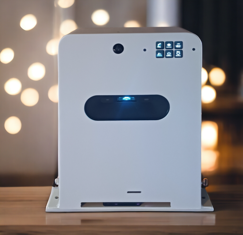 It is equipped with a control panel with shortcuts to software applications adapted to medical needs, and an automatic rotating head allowing projections in table, floor, wall and even ceiling mode.